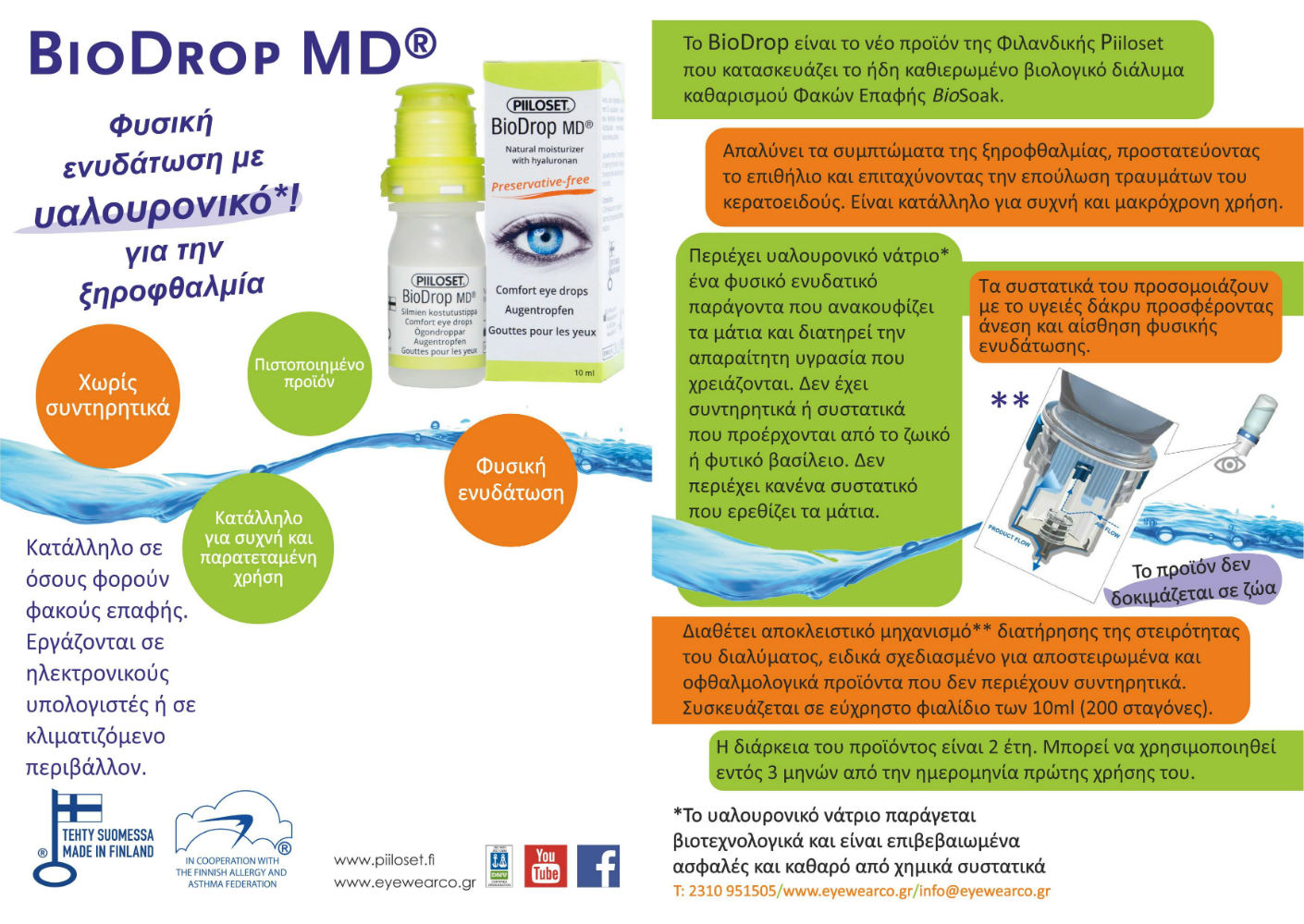Το BIODROP MD δεν έχει συντηρητικά η συστατικά που προέρχονται από το ζωικό η φυτικό βασίλειο και δεν περιέχει κανένα συστατικό που ερεθίζει τα μάτια. Οι χημικές και φυσικές ιδιότητές του έχουν προσαρμοστεί ώστε να προσομοιάζουν με το υγιές δάκρυ, προσφέροντας αίσθημα και άνεση φυσικότητας.